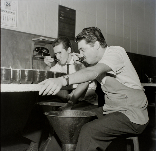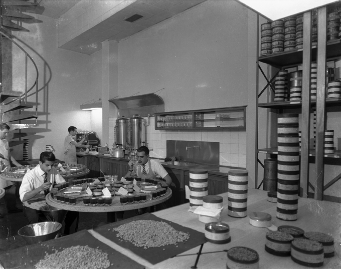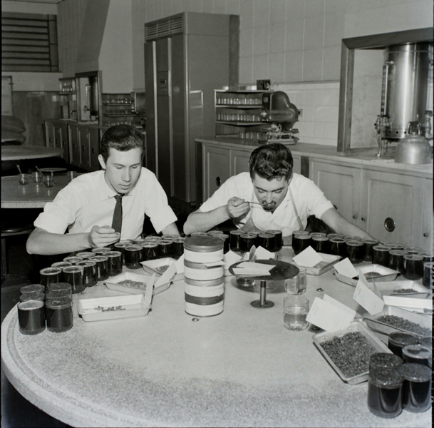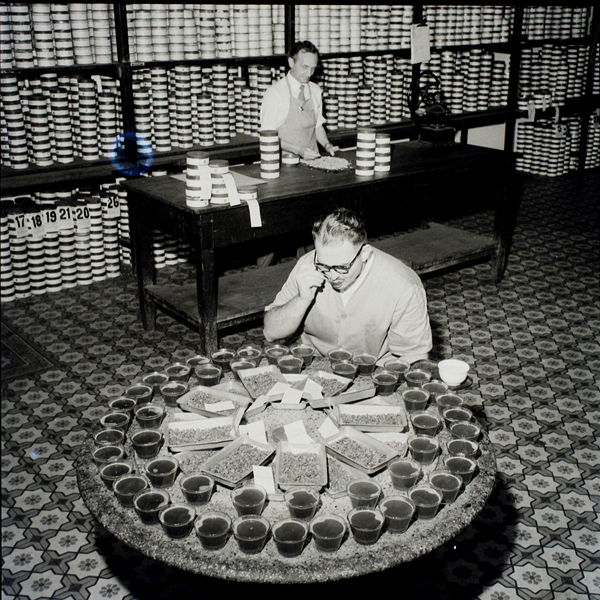 Ah, com torradores, próprios para torrar café. E taças. Você usa o café, tem um moedor, um moinho de café, você faz uma granulação mais elevada do que a de consumo, mais grossa, só para a prova. É uma colher de sopa, menor do que a de sopa. E, aí, você põe água fervente, deixa a borra descer. E, aí, faz a prova, pelo olfato, pelo gosto, e marca em todas as [inaudível], o que é que é, aquele lote que veio por intermédio do corretor tal. Eu vou mostrar para você, já. O corretor trouxe um lote e... nós, pela prática, temos conhecimento mais ou menos de um onde veio esse café, onde é que foi produzido o café. Hoje, não é muito levado em consideração, mas, antigamente, era basicamente isso. Em 100 amostras, a gente provava 20 − 80, não precisava, porque é a gente sabia que era daquele produtor que ter vendia todos anos, um café naquela região, que só bebia bem, o que só bebia mal. Então, ele usava para um outro tipo de café [inaudível]. A classificação feita por peneira, você tira os cafés de... sabe? graúdo, para os compradores que exigem café mais graúdo.