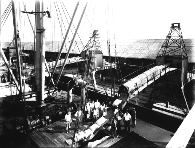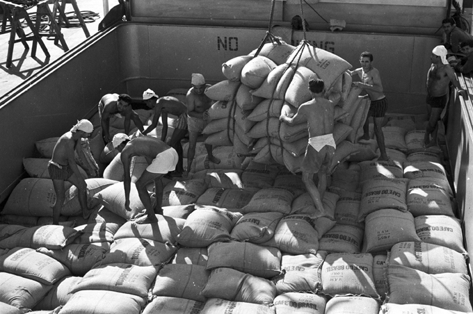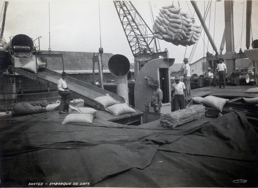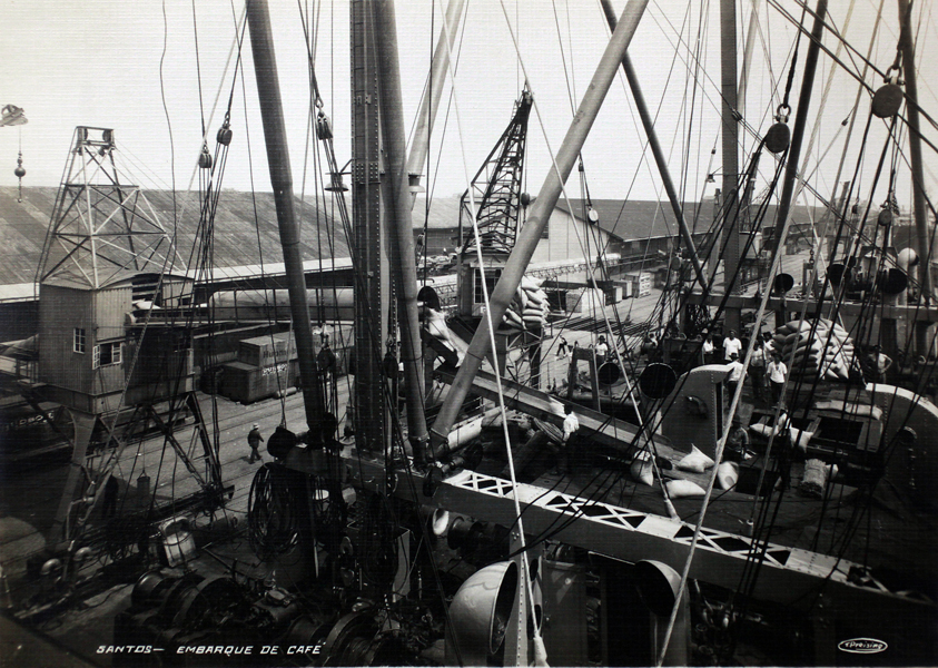 É, que ainda está lá, trabalhando. Assim era feita a distribuição. Então, a distribuição era assim. Por exemplo, um terno de café. Um terno de café trabalhava com doze homens. Sendo assim, os 12 homem, era um mestre que tirava esses doze homens na parede — excluía esses 12 homens na parede. Então, eram quatro que operavam no convés, em cima, que eram dois guincheiros e dois porta-ló. E os outros oito homens erra para baixo, era para pegar no saco. E os de cima conduziam a lingada que, em docas, né, terra, os sacos de café eram acondicionados em estropos, que nós chamávamos de lingada. Estropo, eram as cordas que eram — que tinham capacidade para 1.800 quilos. Então, ia uma base de 30 saco em cada lingada. Quando o guindaste tinha uma potência maior, ele pegava de duas. Então, iam 60 sacos em cada lingada. Então, esses homens de cima é os que transportavam para o porão. E os oito homens de baixo é que faziam a estivagem dos sacos — daí, o nome de estiva, né? Faziam a estivagem dos sacos de café, acomodavam os sacos de café no porão do navio. Essa era a distribuição dos ternos, né? Mas quando tinha um embarque que trabalhava com o guindaste de docas, que era o guindaste de terra, aí não tirava doze homens, tirava dez. Porque já não precisava de guincheiros, tá? Nós só tirávamos dois portalós e os oito homens para baixo.